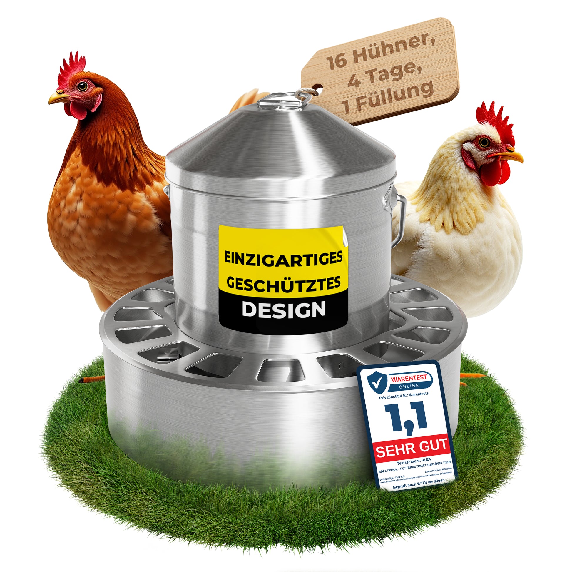Der 4-Liter-EDELTROOX Futterautomat bietet ausreichend Futter für 8 Hühner und hält mit einer Füllung bis zu 4 Tage, abhängig vom individuellen Futterbedarf der Tiere.